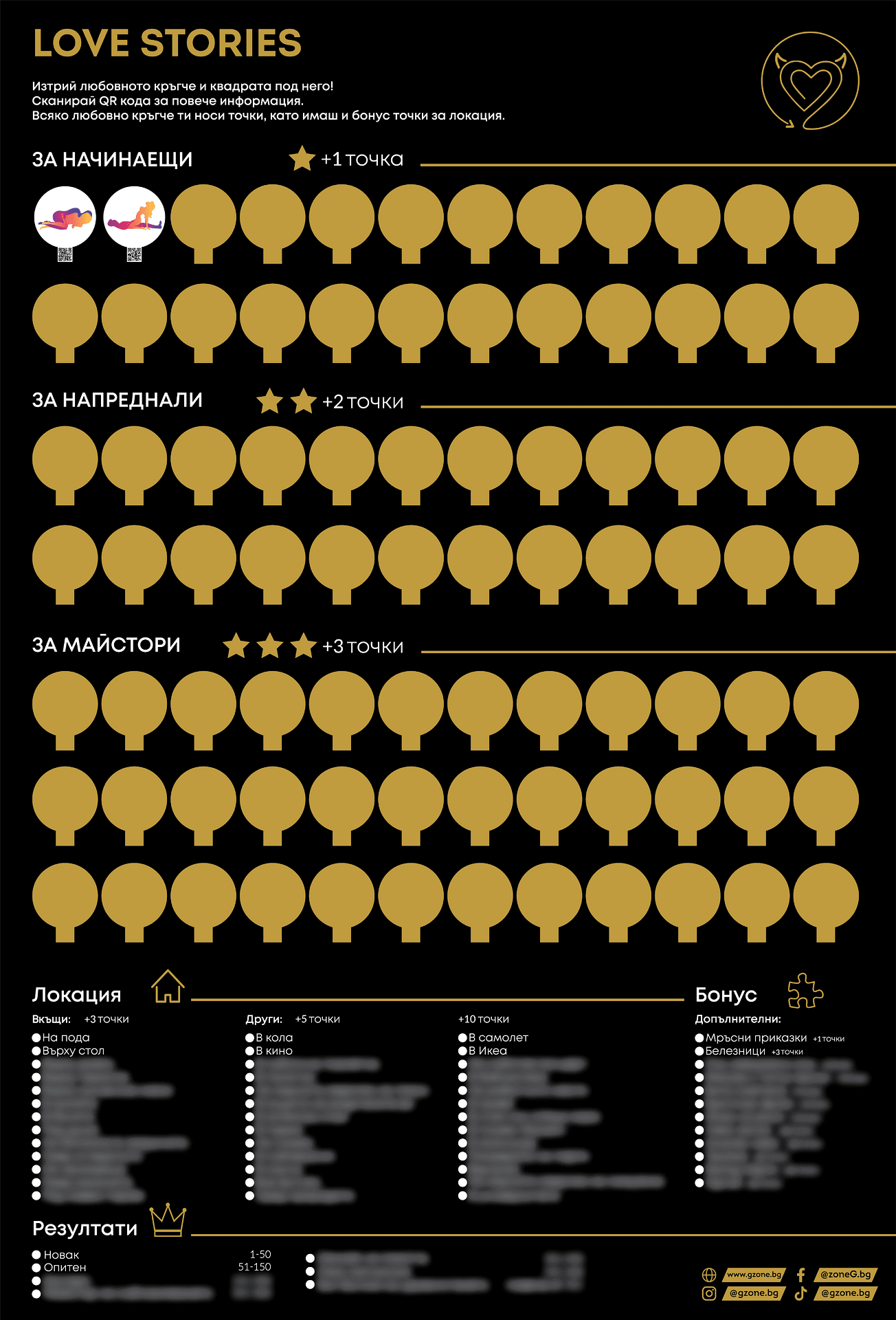 4) Изпълнете позата според възможностите и фантазията си. Всяко „любовно“ задание ти носи точки (1- 3), според нивото на трудност. Не е нужно да спазвате реда на кръгчетата. Затворете очи и изберете на случаен принцип! Спечелете допълнителни точки, ако изпълните позата на място от списъка с предложени места.