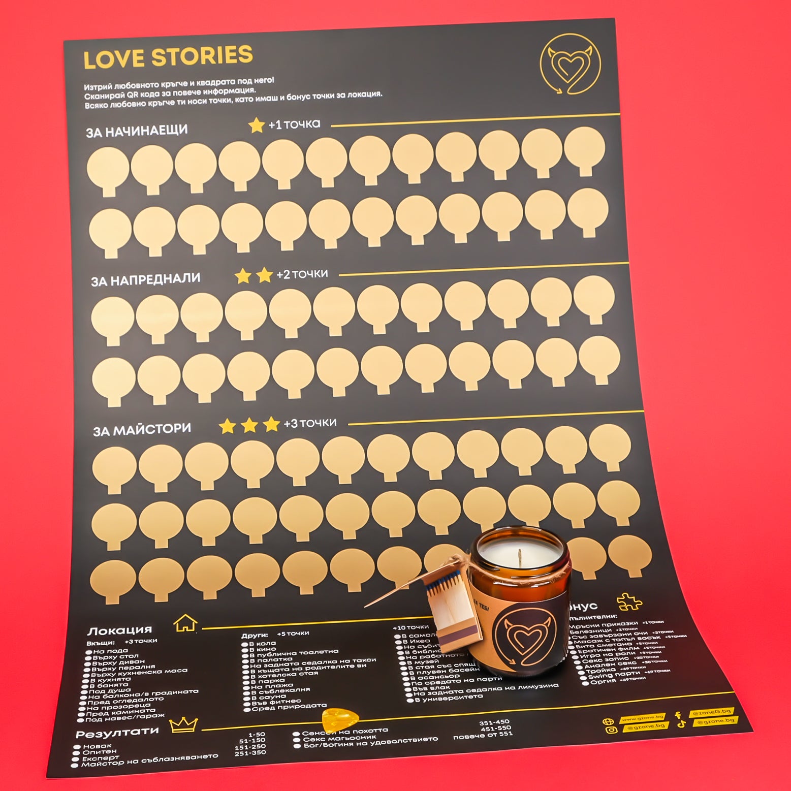 Пакет “Страст и огън” е за двойки, които се придържат към стандартното, биха се впуснали в нови страстни приключения. Изненадай своя партньор с 84 секс пози + 41 места за забавление и ароматен пламък,който да поддържа атмосферата и романтиката помежду ви.